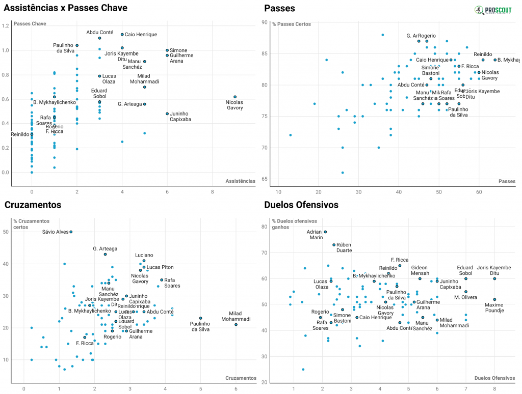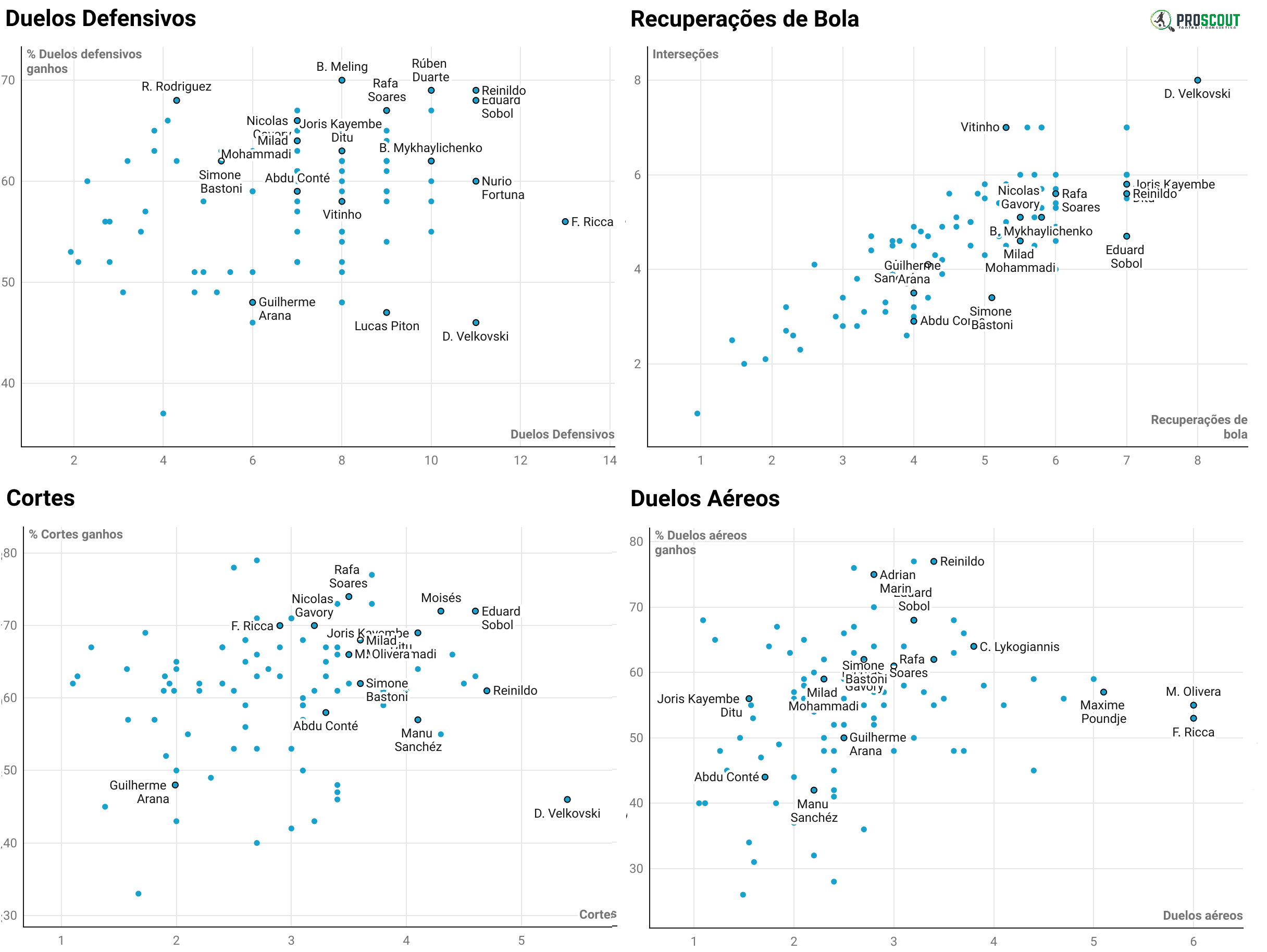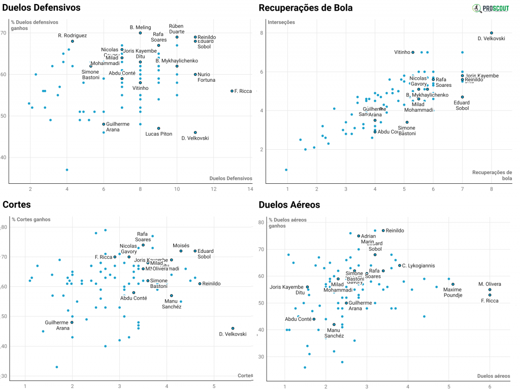 O dado apresentado nos quatro gráficos da imagem em baixo permite-nos perceber quais jogadores se destacam mais ou menos nos parâmetros defensivos.