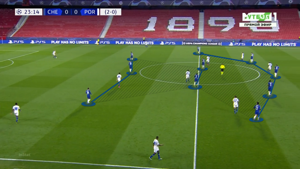 A equipa de Sérgio Conceição reforçou o meio campo com Grujic, Uribe e Sérgio Oliveira e procurou sair a jogar desde trás, atraindo o Chelsea para depois encontrar espaços no seu meio campo ofensivo. Os ingleses conseguiram pressionar alto em determinados momentos mas sem descurar a sua organização defensiva com Jorginho e Kanté sempre próximos da linha defensiva e com uma excelente cobertura nos espaços à frente da mesma.