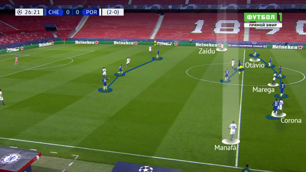 Com as dificuldades para jogar entre linhas, a equipa portista explorou os corredores laterais e a superioridade numérica com Manafá e Corona na direita e Zaidu e Otávio na esquerda.