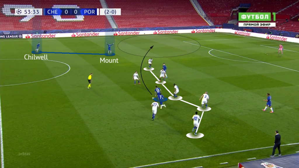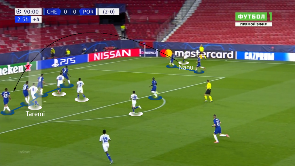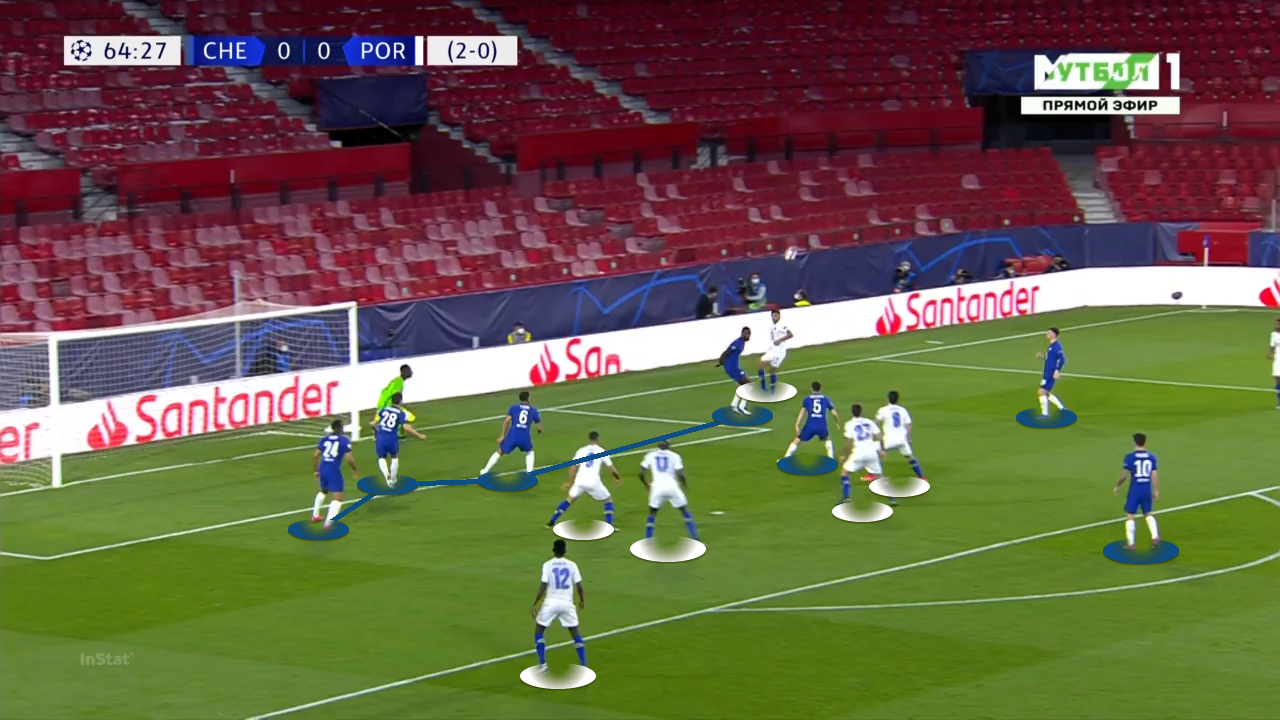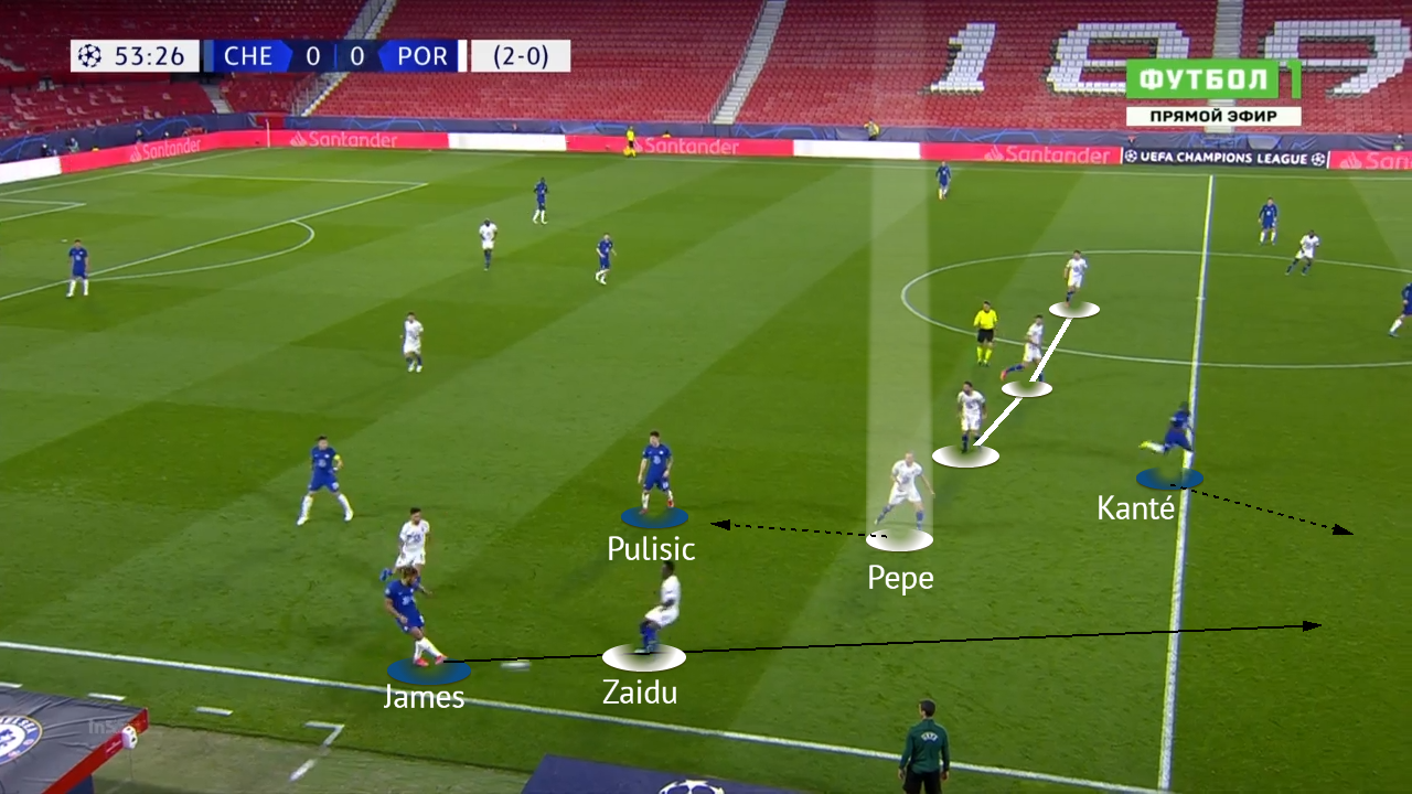 Os blues só saíram em transições rápidas quando o FC Porto não estava organizado e existiam espaços para explorar. A equipa tinha capacidade para ter bola e sair com critério. Pepe a ser atraído pela descida de Pulisic e Kanté a aparecer bem nas costas da linha intermédia.