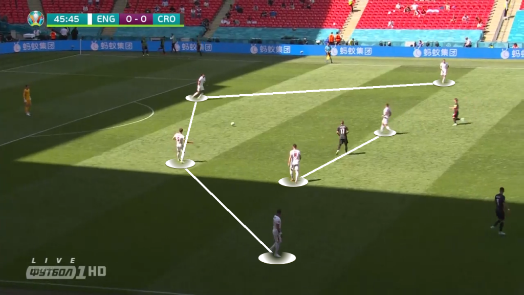 Walker mais próximo dos dois centrais para uma saída a 3 como é habitual na selecção inglesa e os dois médios, Rice e Phillips sempre próximos no apoio.