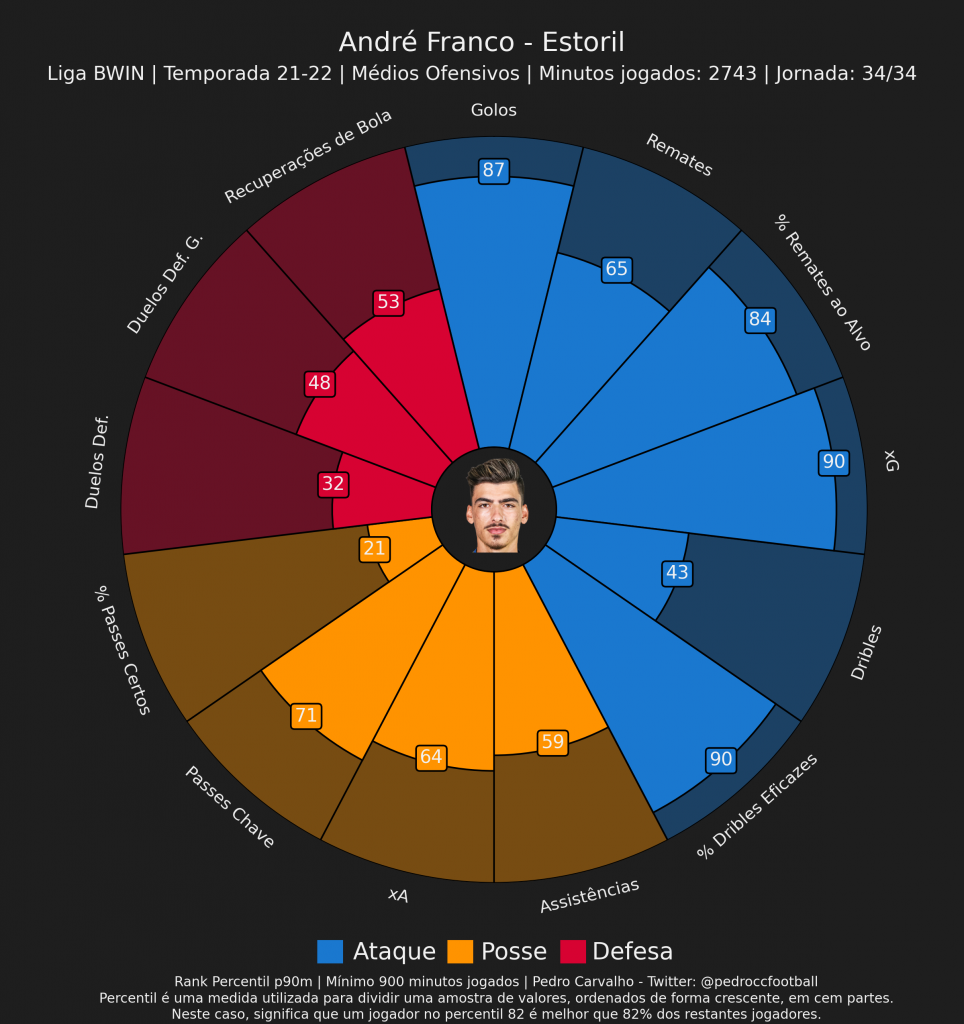 O jovem médio ofensivo de 24 anos destaca-se pela forma como se posiciona entrelinhas para receber a bola, pela qualidade do primeiro toque e na definição. Franco é muito forte tecnicamente e, para além da qualidade de passe e a visão de jogo, revelou-se também muito desenvolvido ao nível da movimentação ofensiva e visão de jogo. André Franco foi a grande figura de uma das equipas sensações do campeonato, foi provavelmente o jogador com maior crescimento esta temporada e muito dificilmente permanece no Estoril mais um ano, sendo já associado a uma transferência para Turquia, segundo o que é noticiado pela imprensa.