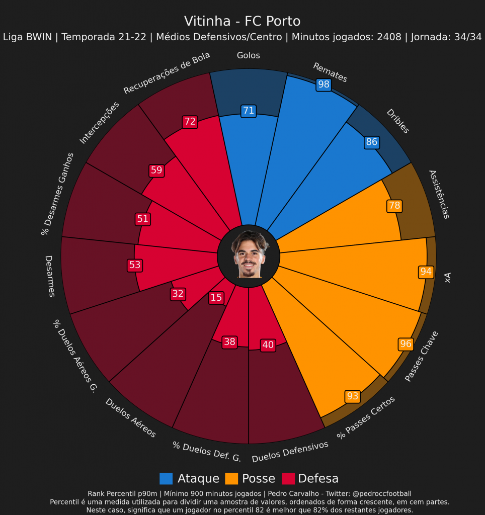 Ao lado de Mateus Uribe, Vitinha mostrou toda a sua qualidade no controlo da bola e no passe, e deu ao jogo do Porto muito critério, fluidez e sobriedade no momento ofensivo. Todas estas características já eram reconhecidas ao jogador portista, que conseguiu juntar a isto muita competência na reação à perda e no momento defensivo, aspeto no qual cresceu de forma exponencial esta temporada. Vitinha foi uma das grandes revelações de um Porto que bateu o recorde de pontos no campeonato, assumiu-se como um dos melhores jogadores a jogar em Portugal e conquistou até o seu espaço na Seleção Nacional.