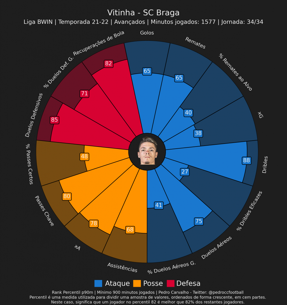 Vitinha é um avançado com uma boa estampa física – 1,84m, forte e móvel, que se destaca pela agressividade e atitude competitiva que coloca no jogo. O jovem do SC Braga é um avançado com muita versatilidade, capaz de dar explorar a profundidade, mas também de jogar em apoio. Não obstante, é um jogador com qualidade técnica, capaz no 1v1, mostra uma boa movimentação e também qualidade na hora de finalizar. Para concluir, Vitinha fez uma boa temporada e mostra muito potencial para crescer e se afirmar como uma figura de destaque no SC Braga, especialmente com uma eventual saída de Ricardo Horta.