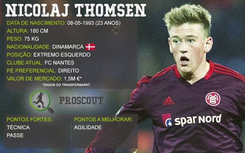 Nicolaj Thomsen, talento dinamarquês formado no Aalborg BK, clube do primeiro escalão da Dinamarca. Estreou-se pela equipa principal em 2011 e rapidamente se tornou numa das estrelas não só da sua equipa como também do campeonato. Com a camisola do Aalborg, Thomsen fez 19 golos e 30 assistências em 150 jogos. A nível internacional, consegue a sua estreia na selecção principal da Dinamarca em 2014 ainda que para já conte apenas com 1 presença. Foi sim na selecção sub-21 onde deu mais nas vistas com 21 partidas e 3 golos apontados. Esta época foi contratado pelo FC Nantes da Ligue 1 de França por 600.000€ e já leva consigo 1 golo em 2 partidas.