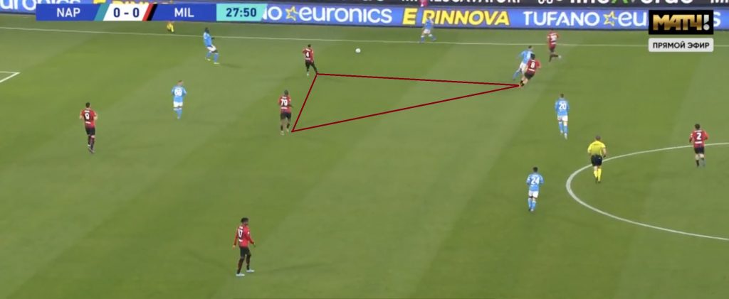 - Daí a equipa procurar em jogos mais complicados, criar agressivas zonas de pressão pelo corredor central, onde tem o trio de médios mais agressivo capazes de recuperar inúmeras bolas ainda em terreno adversário. No jogo contra o Nápoles, Kessié, Tonali e Bennacer simplesmente neutralizaram o forte trio de médios oponente (Fabián Ruiz, Lobotka e Zielinski), obrigando mesmo Spaletti a ter de os substituir na 2ª parte!